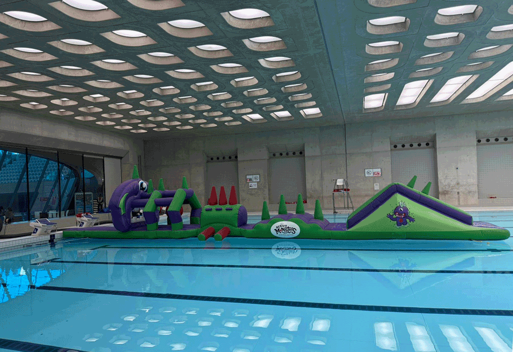 The Aqua Run Inflatable Party is set up in the training pool with one half of the pool having an inflatable aqua run and the other half of the pool set up as a disco with floats.