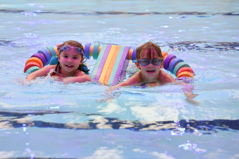The Swim Disco Party is set up in one half of the training pool and has floats in the water as well as music and lighting.